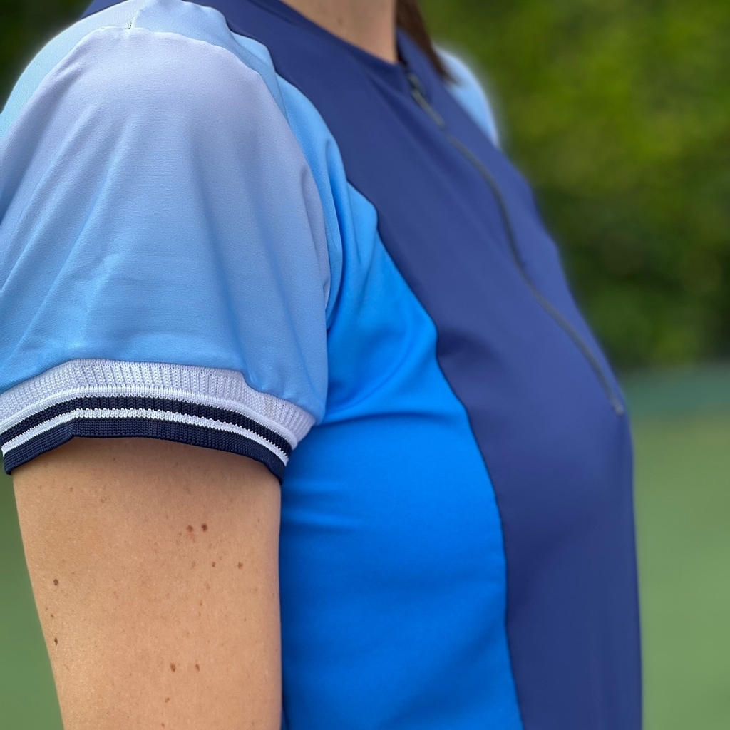 A camiseta foi confeccionada em malha na cor azul marinho com recortes laterais em malha azul degradê.